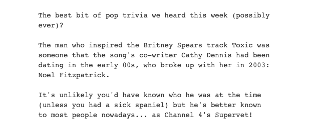 Noel fitzpatrick appearing as the supervet on channel 4 channel 4 supervet. The man who inspired the britney spears track toxic was someone that the songs co writer cathy dennis had been dating in the early 00s who broke up with her in 2003. Growing up noel fitzpatrick found solace and sanctuary from bullies in the company of his sheepdog.
